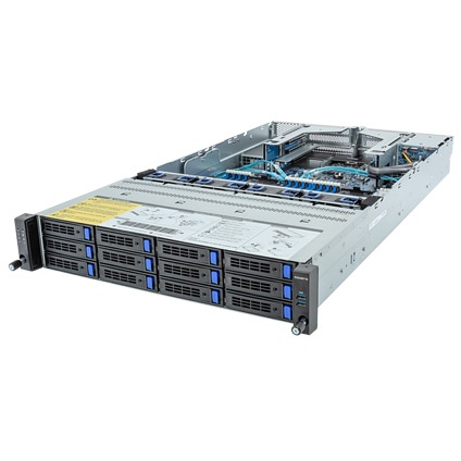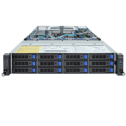 The Gigabyte Server R283-S90 (Rev. AAE2) 2U Rackmount Server features dual socket 4th Gen Intel Xeon Scalable Processors, 32x DDR5 ECC RDIMM slots, comes with 12 x 3.5"/2.5" SATA hot-swap bays, and 2 x 2.5" SATA hot-swap bays on rear side. The R283-S90 (Rev. AAE2) is equipped with 4x 80mm 18,300RPM cooling fans, and 2000W 80 plus platinum redundant power supply.