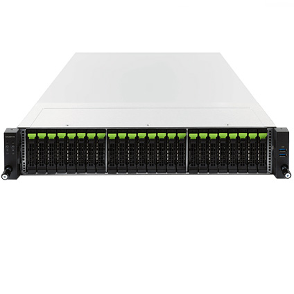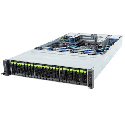The Gigabyte Server R283-S92 (Rev. AAE1) 2U Rackmount Server features dual socket 4th Gen Intel Xeon Scalable Processors, 32x DDR5 ECC RDIMM slots, comes with 24 x 2.5" Gen4 NVMe/SATA hot-swappable bays, 4 x 2.5" SATA hot-swappable bays on rear side. The R283-S92 (Rev. AAE1) is equipped with 4x 80mm cooling fans, and 2000W 80 plus platinum redundant power supply.