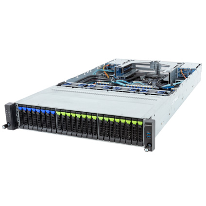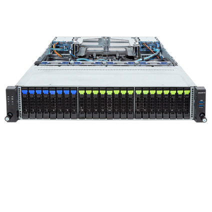 The Gigabyte Server R283-S92 (Rev. AAE2) 2U Rackmount Server features dual socket 4th Gen Intel Xeon Scalable Processors, 32x DDR5 ECC RDIMM slots, comes with 24 x 2.5" Gen4 NVMe/SATA hot-swappable bays, 4 x 2.5" SATA hot-swappable bays on rear side. The R283-S92 (Rev. AAE2) is equipped with 4 x 80mm cooling fans, and 2000W 80 plus platinum redundant power supply.