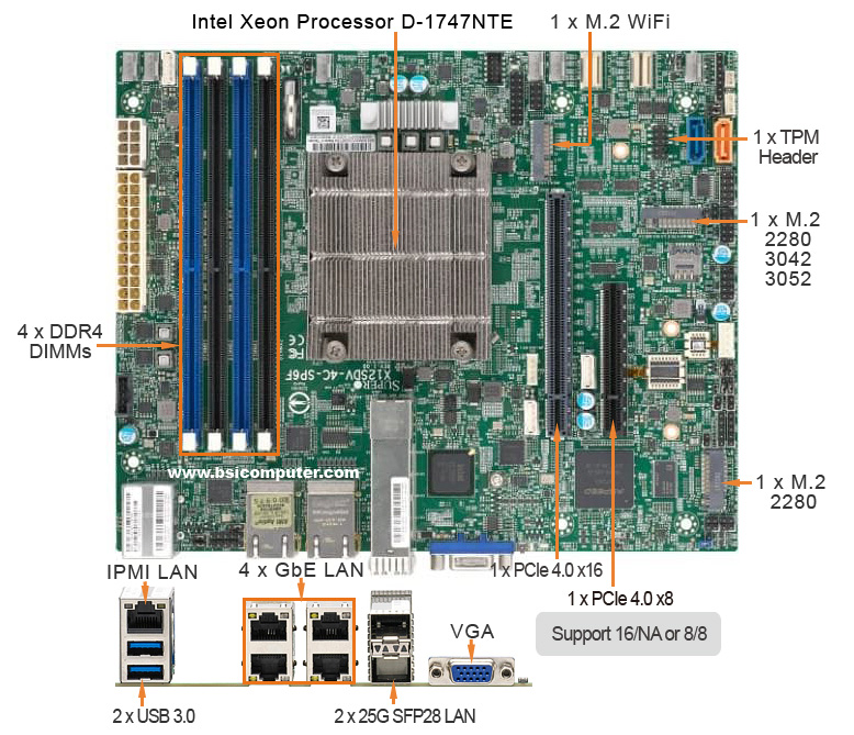 - Built-in 4 x Gigabit LAN, 2 x SFP28 25 GbE LAN, 1x IPMI LAN